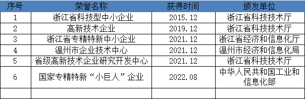 公司先后獲有中華人民共和國特種設備生產許可證TS、美國石油協會API 6D認證、API 607球閥防火認證、歐盟 CE認證、安全完整性等級SIL3認證、ISO9001:2008質量管理體系認證、ISO14001:2004環境管理體系認證、GB/T28001-2011職業健康安全管理體系認證;同時取得中石化、國電集團、華能集團、華電集團、大唐集團、中電投集團、中廣核集團、神華集團、中國化工集團、中糧集團、中國建筑集團、國家能源集團、浙江能源集團、中國能建集團、中國電建集團等幾百家央企、國企、集團合格供應商;并被授予國家高新技術企業、浙江省科技型企業、溫州市科技創新企業、2018年溫州市高成長型企業、2018年溫州市“畝均論英雄”企業、溫州市企業技術研究開發中心、重合同守信用A級單位、銀行信用AAA級企業、浙江省優質產品稱號、溫州市知名商標、中閥協會員單位、溫州市閥門協會和龍灣區閥門協會副會長單位等眾多榮譽。